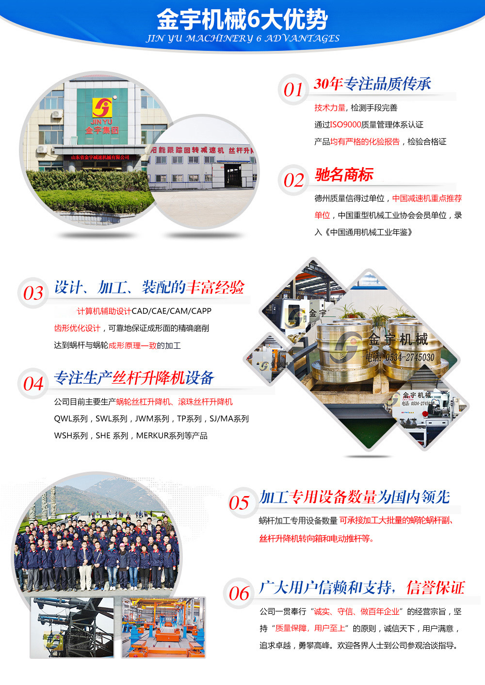 金宇機(jī)械生產(chǎn)滾珠絲桿升降機(jī)、絲桿升降機(jī)、QWL蝸輪絲桿升降機(jī)、JWM絲桿升降機(jī)、回轉(zhuǎn)減速機(jī)等產(chǎn)品。